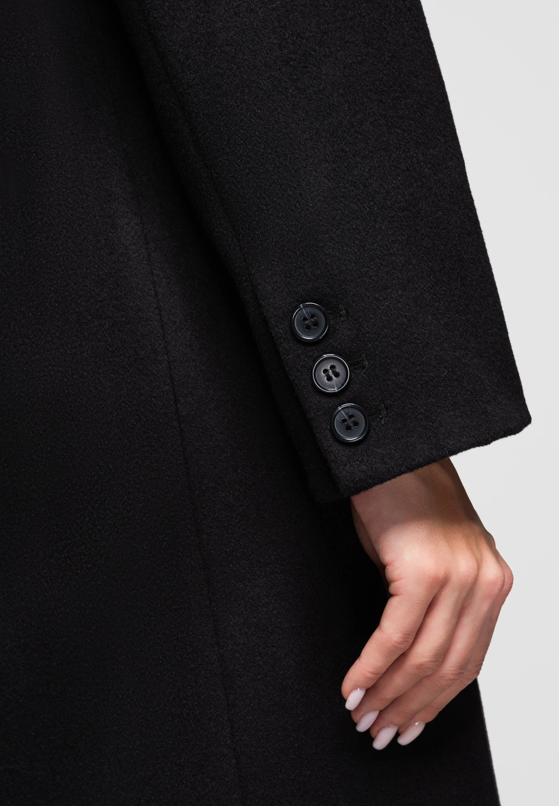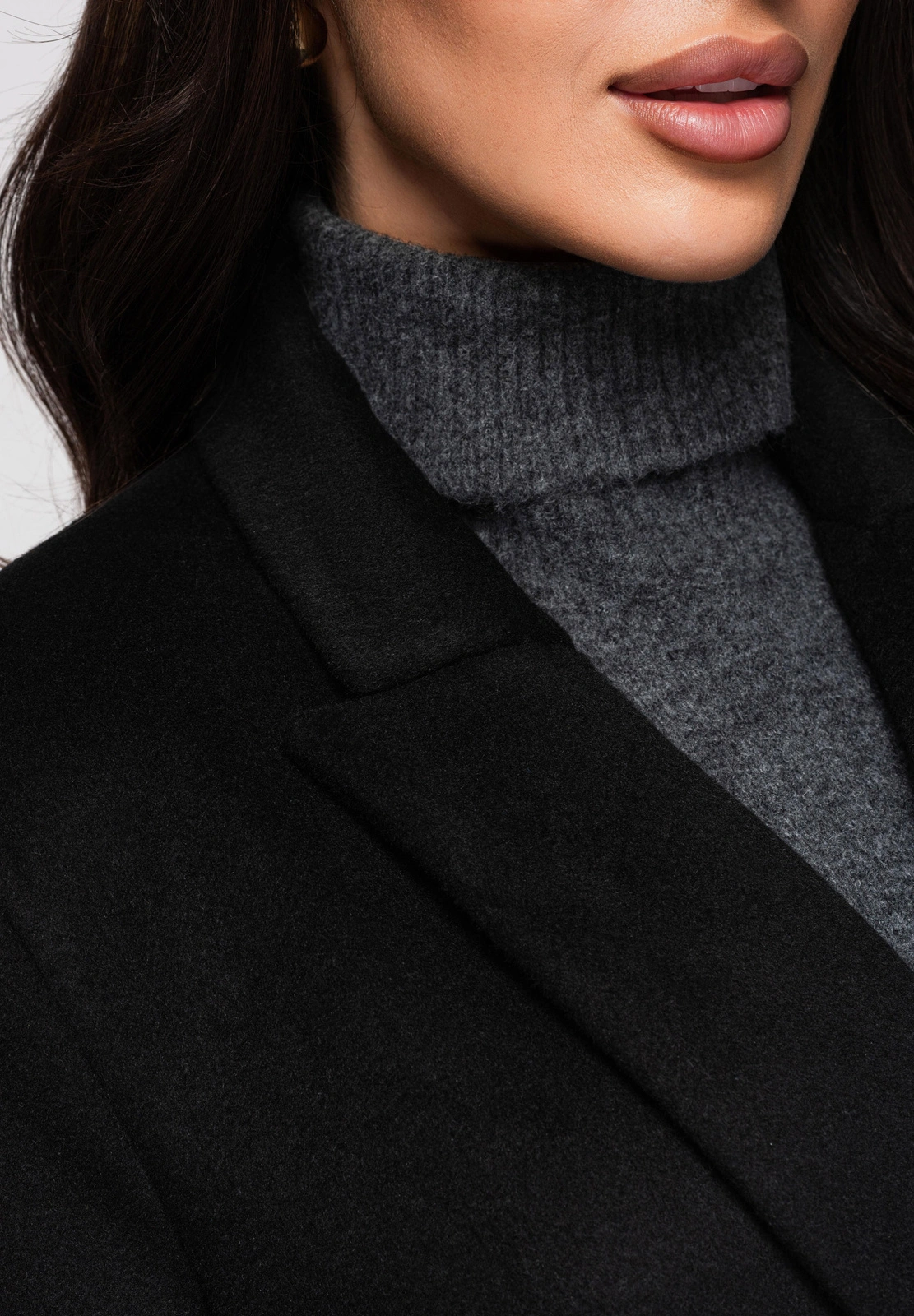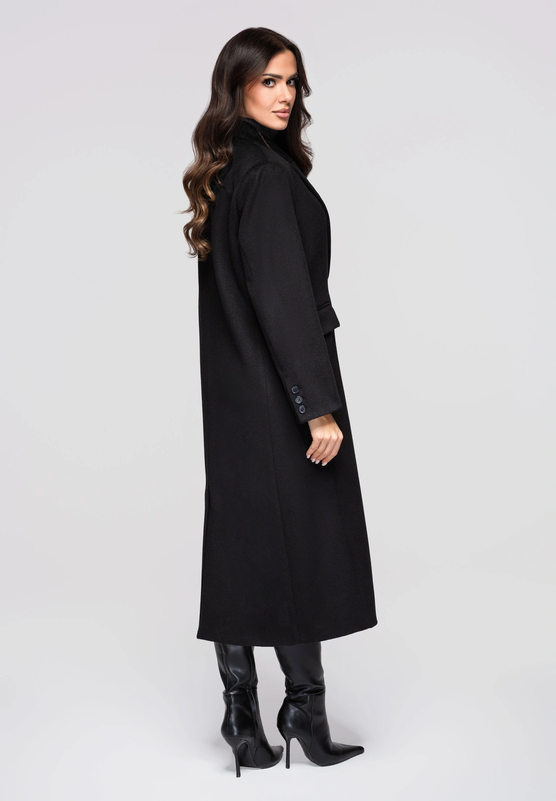 Komfortowy, długi płaszcz o modnym, oversizowym kroju, który gwarantuje swobodę ruchów. Jest to model dwurzędowy, zapinany na guziki. Materiał zewnętrzny to ciepła mieszanka z dominującą wełną (52,4%), poliestrem, wiskozą, akrylem i poliamidem, posiadająca delikatny włosek. Płaszcz posiada klasyczny kołnierz rewersowy (marynarkowy) i wykończony jest od wewnątrz podszewką z poliestru i wiskozy. Konstrukcja zawiera rozporek z tyłu dla lepszego komfortu chodzenia oraz dwie praktyczne kieszenie z klapami. Charakterystyczne detale to ozdobne, szylkretowe guziki przy mankietach oraz imitacja kieszeni umieszczona na klatce piersiowej