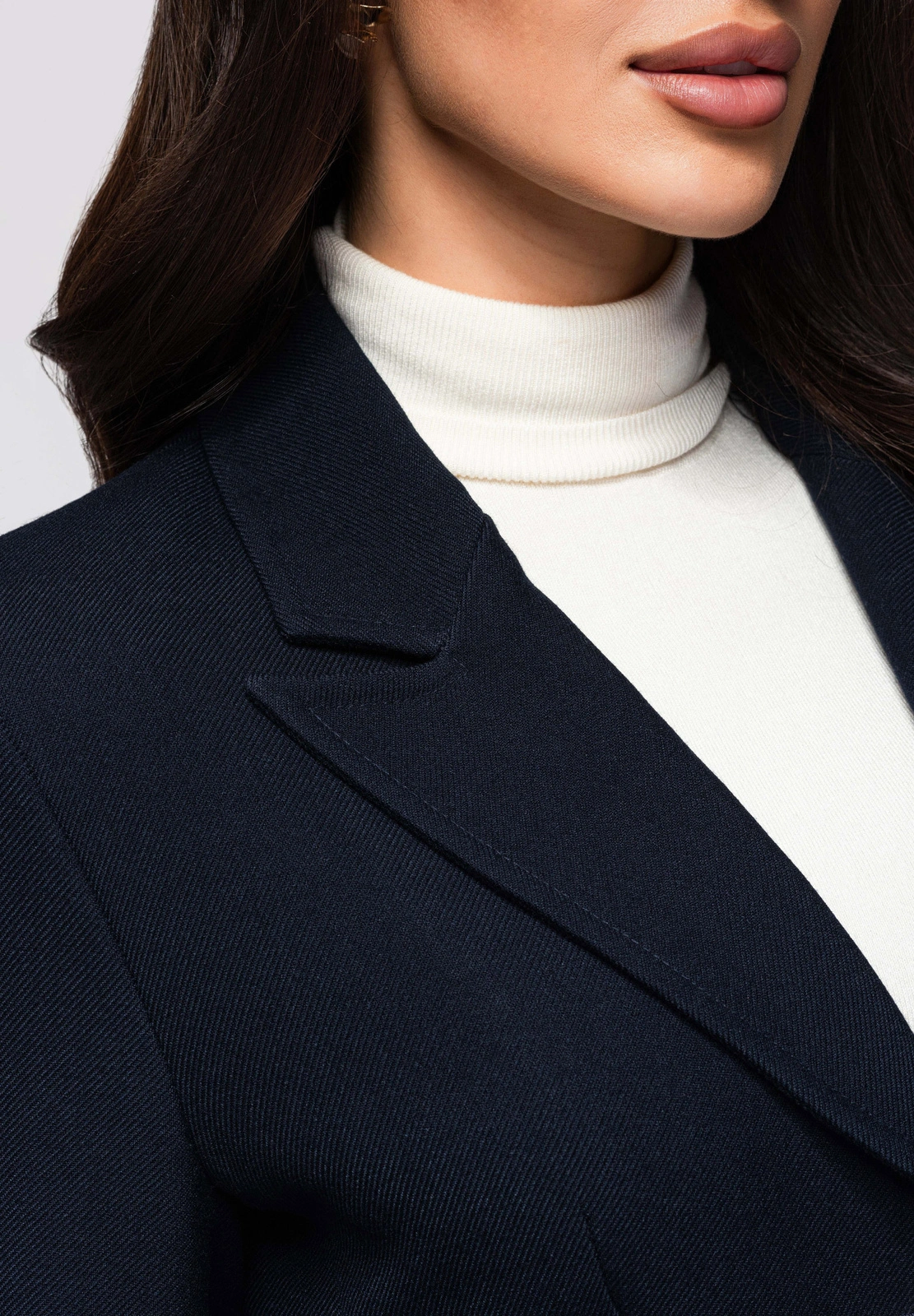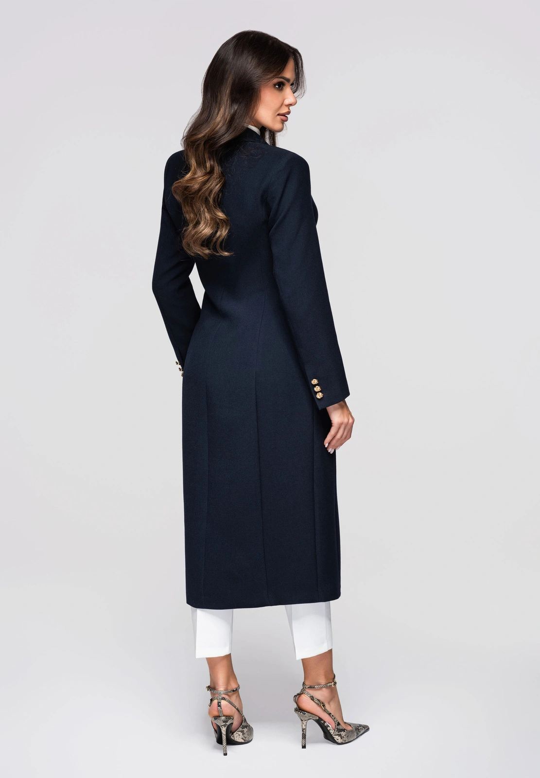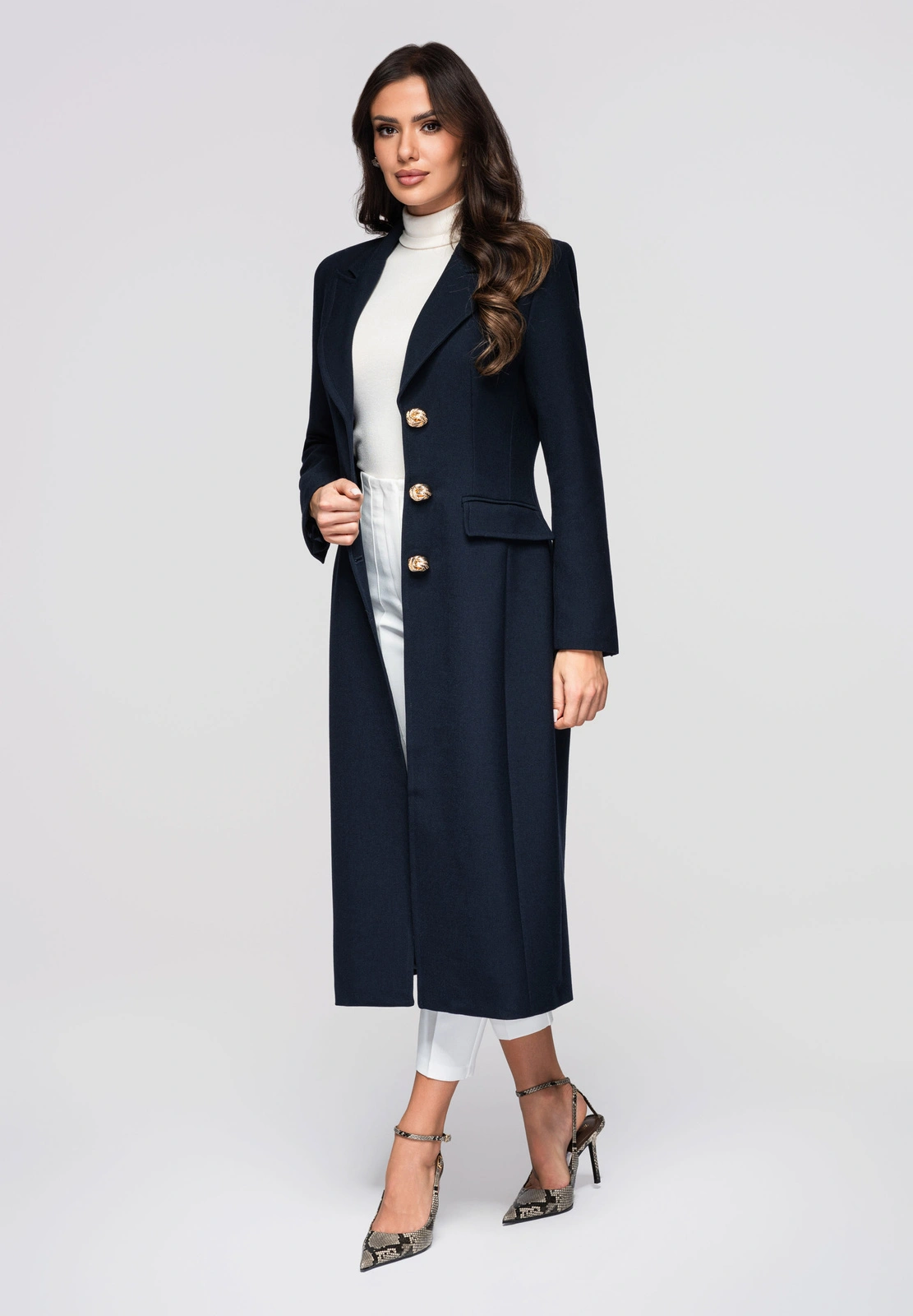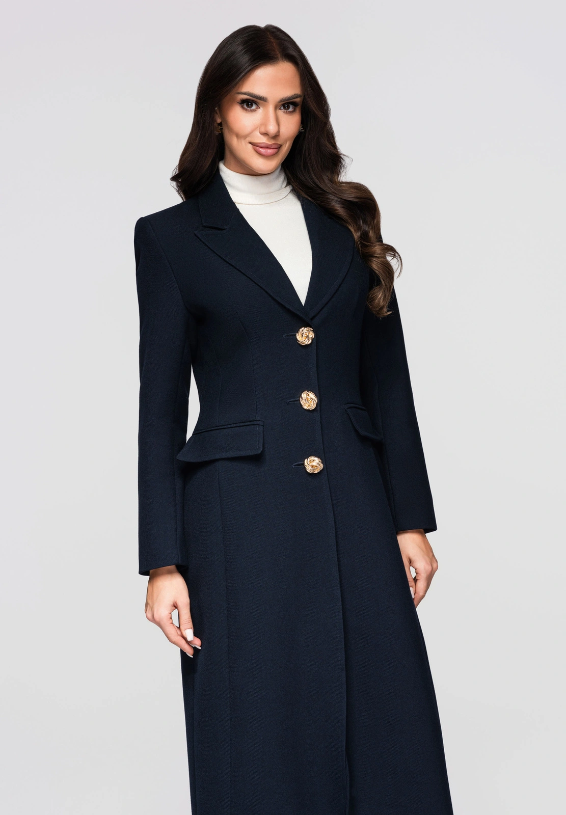 Elegancki, taliowany płaszcz o długości 7/8, idealnie modelujący sylwetkę. Materiał zewnętrzny to tkanina o strukturze twill (skośny splot), wykonana z mieszanki 90% poliestru, 7% rayonu i 3% elastanu, zapewniającej komfort i lekką elastyczność. Wnętrze wykończone jest gładką podszewką ze 100% poliestru. Płaszcz jest zapinany na rząd ozdobnych guzików, które stanowią główny detal dekoracyjny. Posiada klasyczny kołnierz rewersowy oraz dwie funkcjonalne kieszenie z klapami. Dodatkowo mankiety rękawów ozdobiono guzikami, co podnosi estetykę wykończenia. To uniwersalne okrycie wierzchnie, które łączy formalny styl z wygodą noszenia.