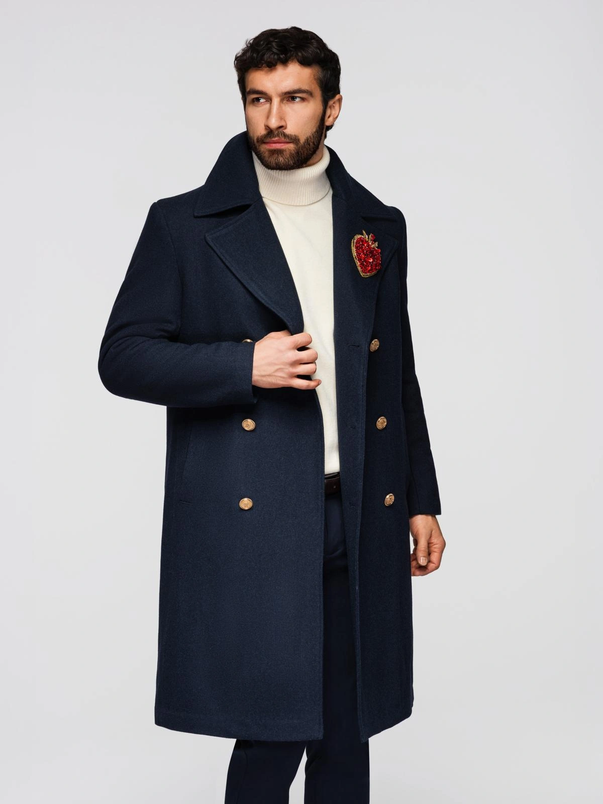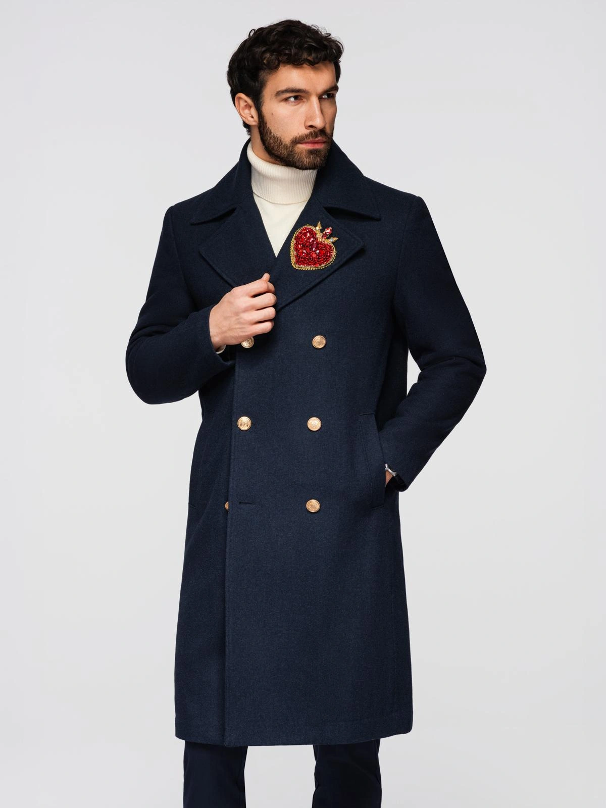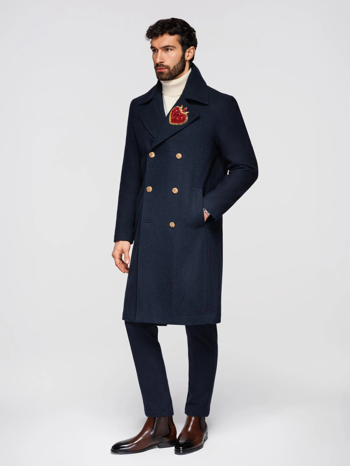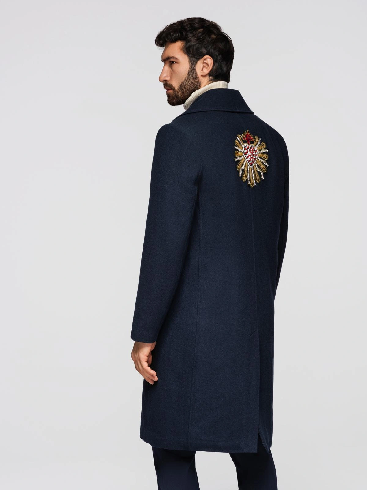 Męski płaszcz z linii Heritage w regularnym kroju, uszyty z gładkiej tkaniny z wełną w kolorze granatowym. Model z dwurzędowym zapięciem na guziki, tylnym rozcięciem, kołnierzem z większymi klapami oraz funkcjonalnym układem kieszeni: dwie po bokach i jedna wewnątrz. Wnętrze wykończone pikowaną podszewką z lekkim wypełnieniem. Detale obejmują złote guziki z motywem herbu oraz aplikacje z koralików w kształcie serca na klapie i na plecach.