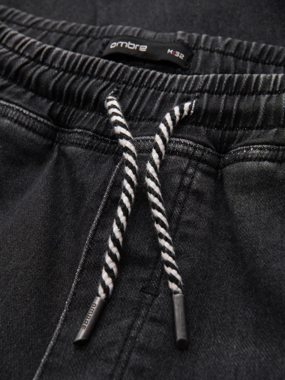 Męskie spodnie jeansowe z linii Ombre Denim w kroju jogger, uszyte z tkanej tkaniny denimowej z elastyczną domieszką. Wykończone wyraźnymi przetarciami na udach, przy kieszeniach i na kolanach. Pas z wszytą gumą oraz nogawki zakończone tunelem z gumką zapewniają stabilne dopasowanie. Dwie wpuszczane kieszenie z przodu i dwie naszywane z tyłu; worki kieszeniowe z bawełny zwiększają trwałość. Model dopełniają metalowe nity i oczka w kolorze starego srebra, brandowane końcówki sznurków oraz naszywka ze sztucznej skóry na tylnej kieszeni.
