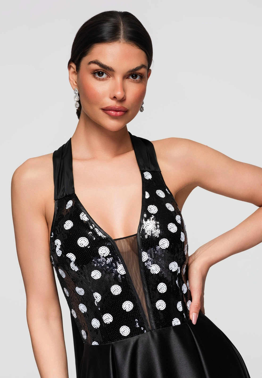 Sukienka wieczorowa o długości maxi z rozkloszowaną spódnicą w kształcie litery A. Model z odkrytymi ramionami i szyją, z konstrukcją typu halter wiązaną na szyi. Góra dopasowana, ozdobiona cekinami w kontrastowym wzorze, z głębokim dekoltem w kształcie litery V, którego środkowa część została wykonana z siateczki stabilizującej linię biustu. Spódnica wykonana z nieprzezroczystej, połyskującej tkaniny o satynowym wykończeniu, z rozcięciem umieszczonym z przodu. Zapięcie na zamek z tyłu. Konstrukcja łącząca dwa rodzaje materiałów, zapewniająca stabilność formy i elegancki układ tkaniny.