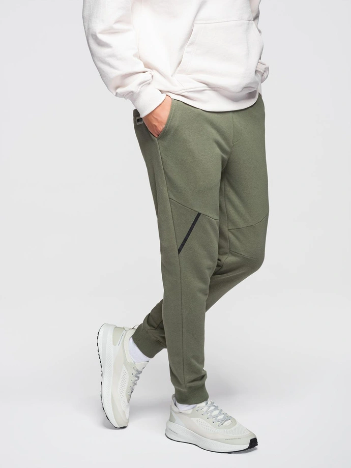 Męskie spodnie typu jogger o kroju regular, uszyte z gładkiej dzianiny z delikatnym melanżem. Pas regulowany sznurkiem, nogawki zakończone ściągaczem dla stabilnego dopasowania. Dwie kieszenie z przodu i pojedyncza kieszeń tylna. Przód nogawek z ozdobnymi cięciami, wzbogacony silikonowym nadrukiem. Elementy wykończone brandowymi detalami akie jak oczka w pasie czy końcówki sznurka.