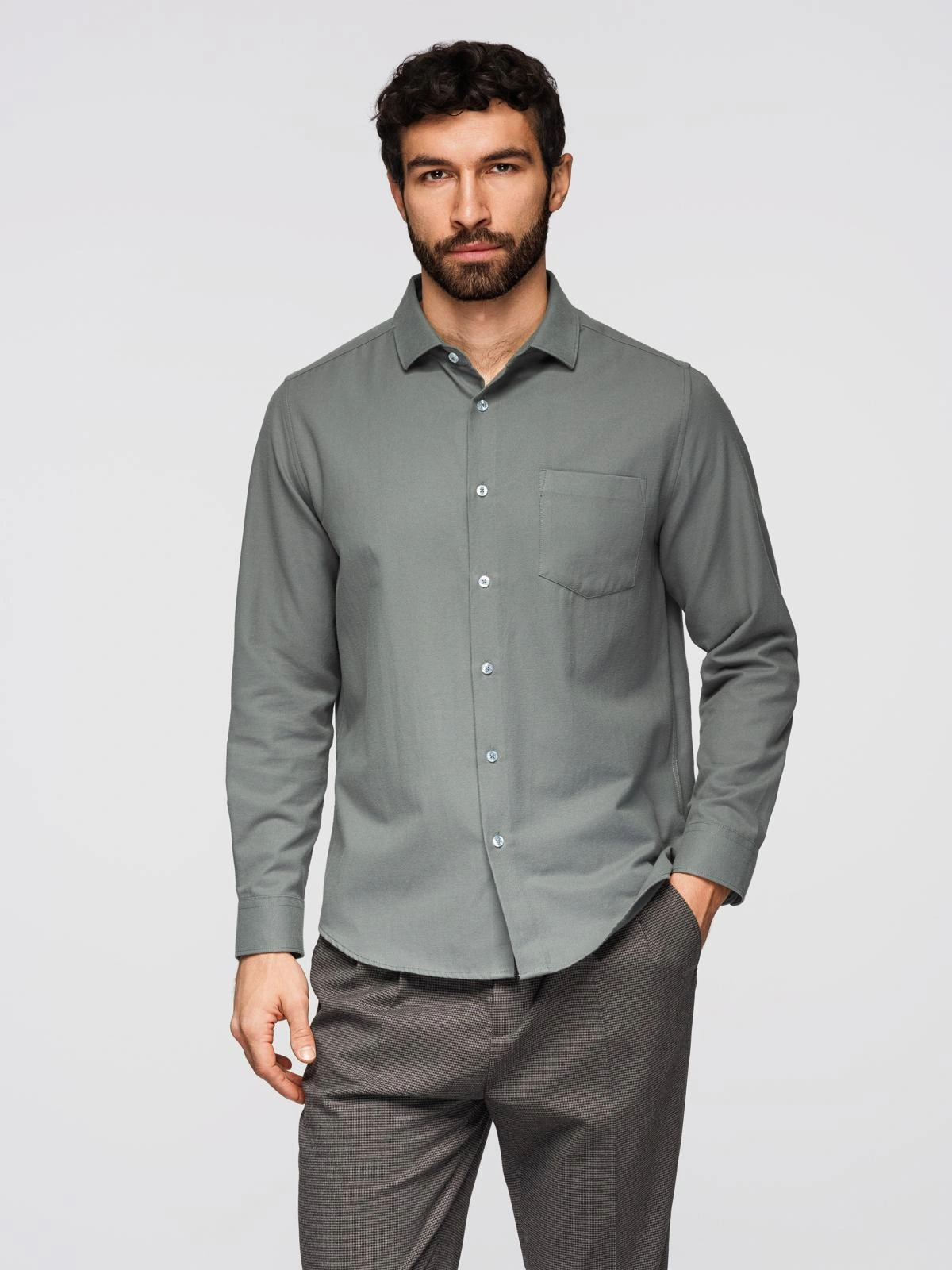 Męska koszula o kroju regular fit. Pełne zapięcie na guziki i klasyczny kołnierzyk. Kieszeń na piersi ułatwia przechowywanie drobnych przedmiotów. Długie rękawy z guzikiem zabezpieczającym oraz zapinanym mankietem umożliwiają wygodną regulację obwodu nadgarstka. Zaokrąglony dół ułatwia noszenie koszuli wpuszczonej w spodnie i na zewnątrz. Bawełna w połączeniu z poliestrem ogranicza gniecenie i upraszcza pielęgnację.