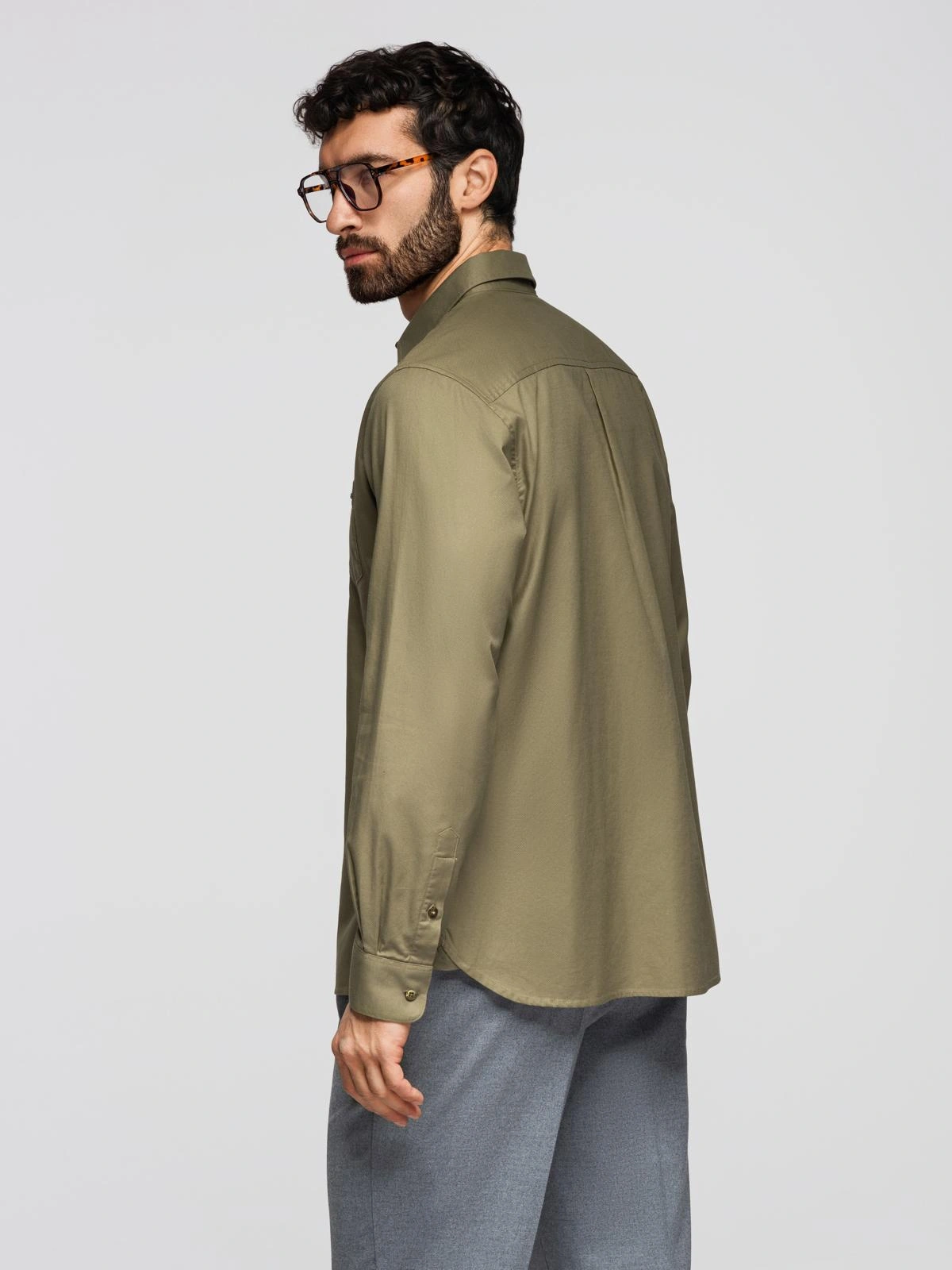 Koszula męska o regularnym kroju, uszyta z tkaniny bawełnianej. Klasyczny kołnierzyk i pełne zapięcie na guziki zapewniają stabilne ułożenie. Długi rękaw zakończony mankietem pozwala na dopasowanie obwodu. Na piersi naszyta kieszeń z dyskretnym oznaczeniem marki. Dół półokrągły ułatwia noszenie koszuli zarówno wpuszczonej, jak i wypuszczonej. Na plecach zakładka zwiększająca swobodę ruchu.