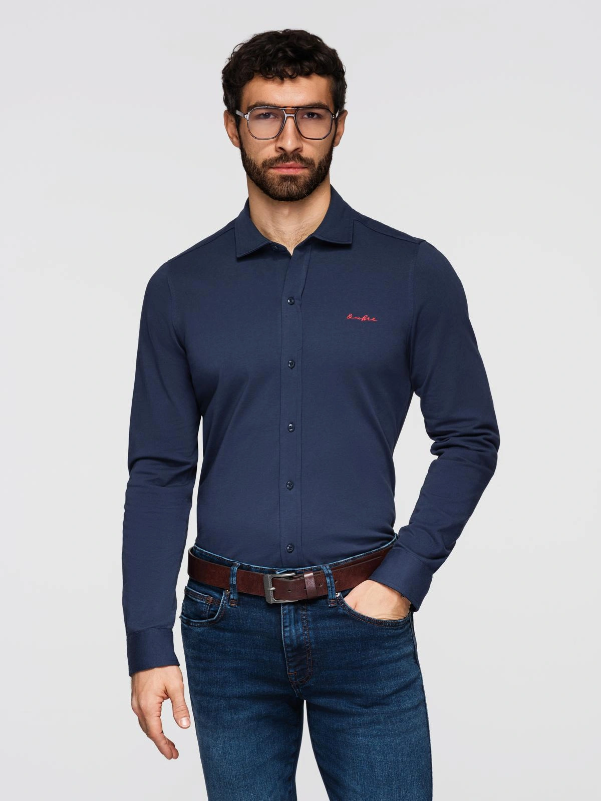 Męska koszula o regularnym kroju z długim rękawem i klasycznym kołnierzem. Zapinana na pełną listwę guzikową; na piersi kontrastowy haft. Z tyłu karczek dla stabilizacji formy. Rękawy zakończone mankietami zapinanymi na guzik oraz rozcięciem z dodatkowym guzikiem. Dół koszuli zaokrąglony. Guziki w kolorze z grawerowanym brandingiem, przyszyte kontrastową nicią dopasowaną do koloru haftu. Dzianinowa konstrukcja zapewnia miękkość i komfort noszenia, a bawełna wspiera naturalną oddychalność i wygodę w codziennym użytkowaniu.