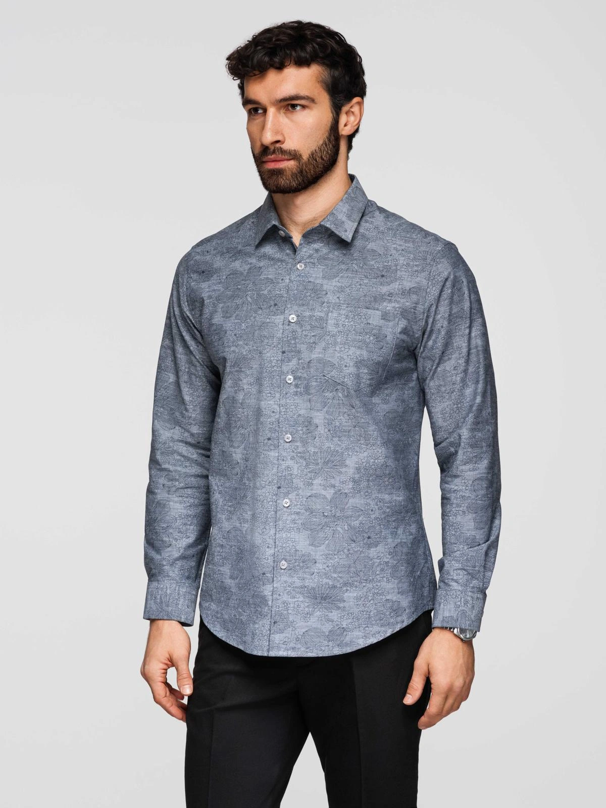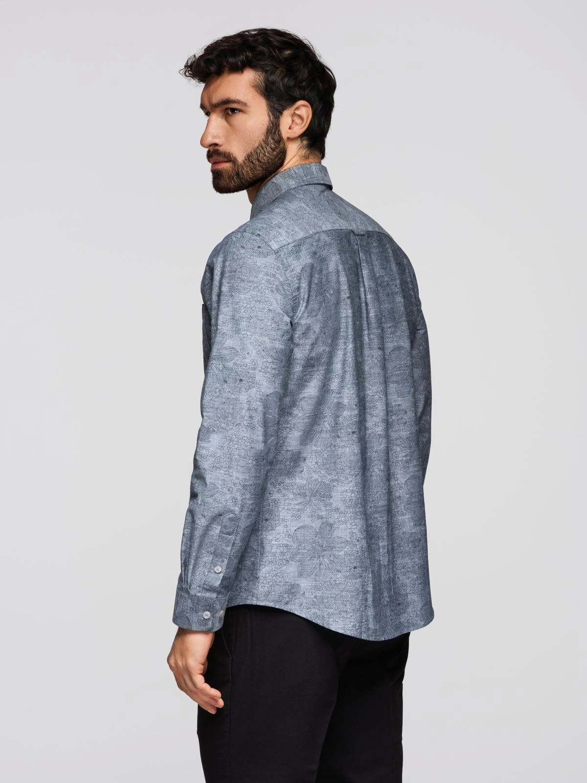 Męska koszula o regularnym kroju z klasycznym kołnierzykiem i pełnym zapięciem na guziki. Uszyta z miękkiej, bawełnianej flaneli, zapewniającej komfort cieplny i przyjemny dotyk. Długie rękawy zakończone mankietami na guziki, dodatkowy guzik przy rozporku rękawa. Na piersi kieszeń. Półokrągły dół ułatwia układanie koszuli. Z tyłu karczek z kontrafałdą dla swobodniejszego zakresu ruchu. Tkanina ze stonowanym, kwiatowym nadrukiem.