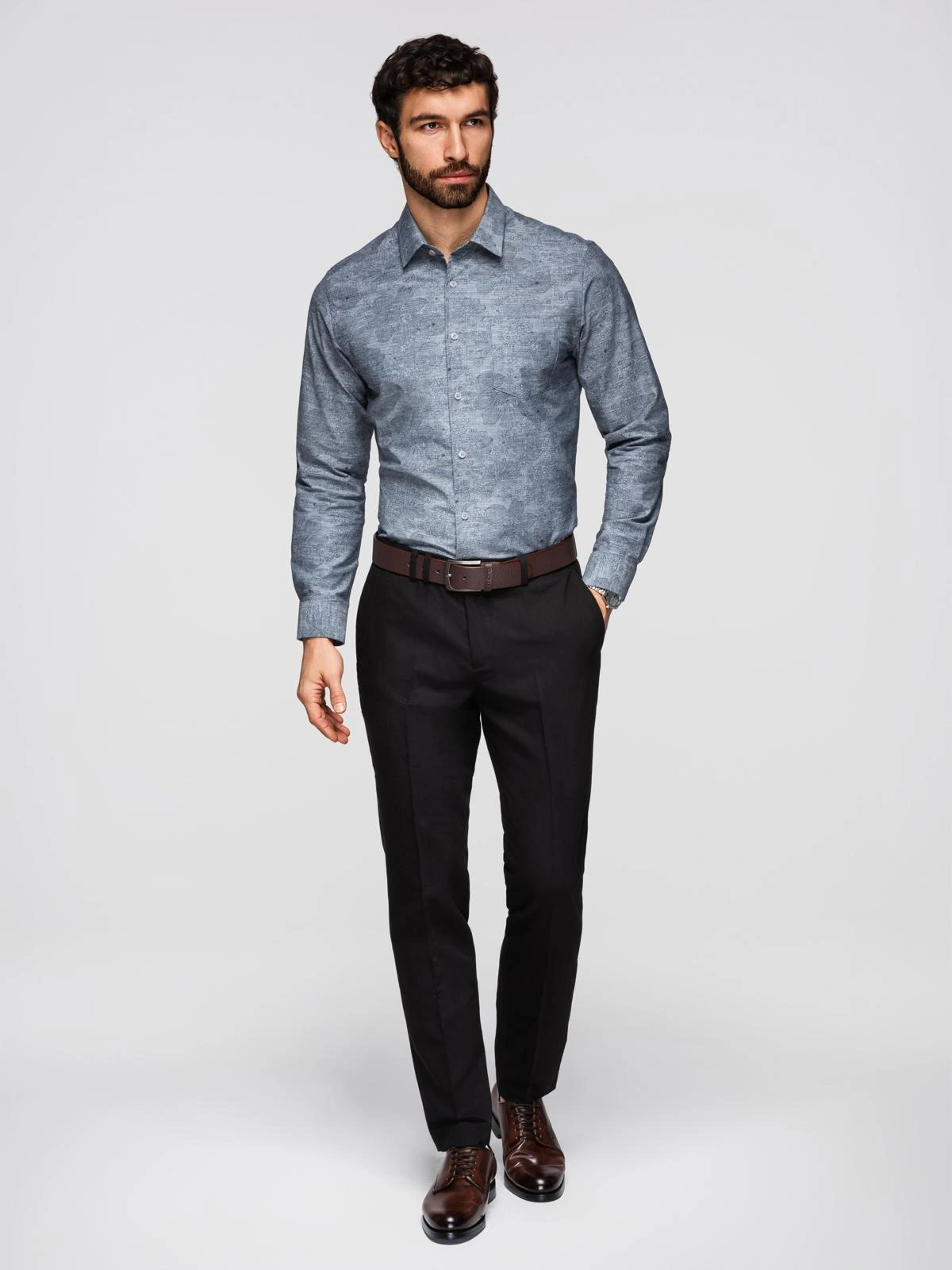 Koszula sprawdzi się jako urozmaicenie codziennych zestawów w kierunku smart casual – na spotkania po pracy, weekendowe wyjścia czy mniej formalne dni w biurze. Stonowany motyw dobrze współgra z gładkimi chinosami lub wełnianymi spodniami w czerni, granacie czy brązach, a także z dżinsami o prostym kroju. Z łatwością wchodzi w warstwowe stylizacje z kardiganem lub lekką marynarką, dodając zestawom spokojnego, dopracowanego charakteru. Dzięki neutralnej kolorystyce może pełnić rolę kluczowego elementu zestawów na chłodniejsze miesiące.